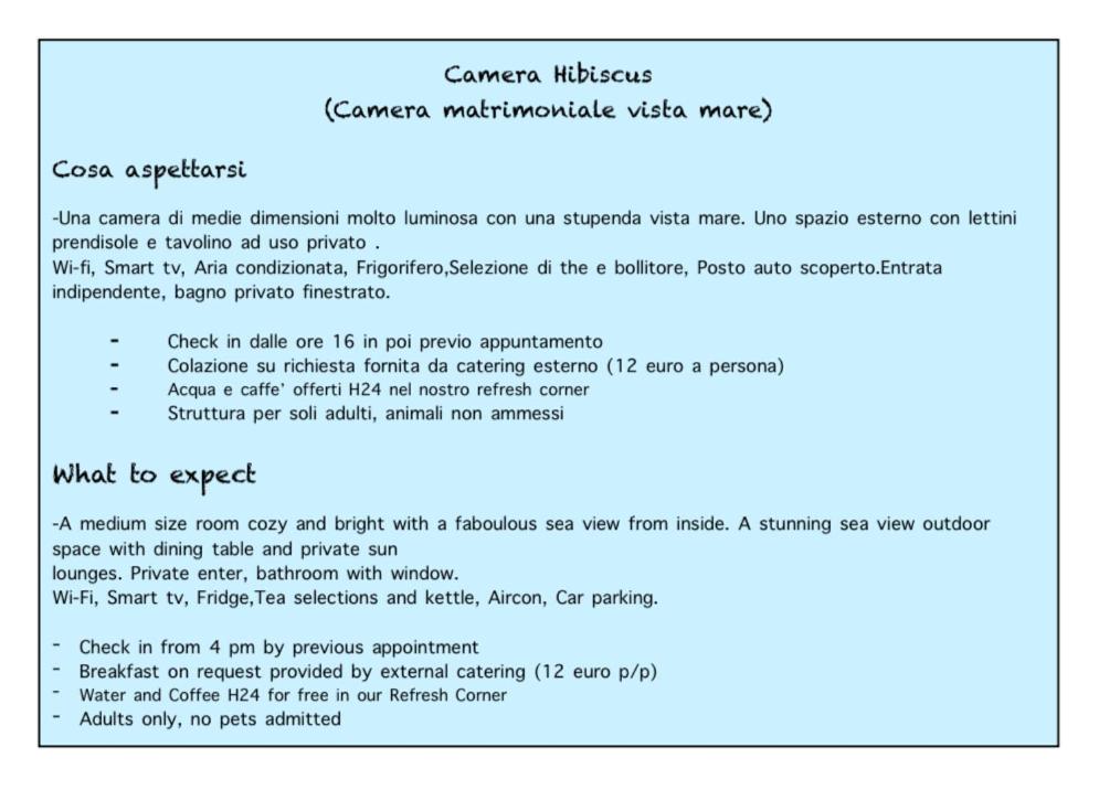 Camera Deluxe Matrimoniale con Vista Mare. La camera matrimoniale è dotata di bagno privato condi cortesia, doccia, bidet e asciugacapelli. La camera matrimoniale è dotata di aria condizionata, TV a schermo piatto, ingresso indipendente,per la preparazione di tè e caffè, armadio e vista sul mare. L’alloggio dispone di 1 letto.